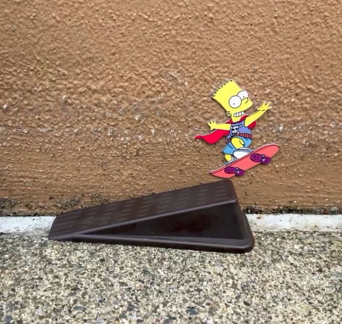 Bart Simpson is depicted skateboarding down a real handrail, merging his rebellious spirit with the physical world.